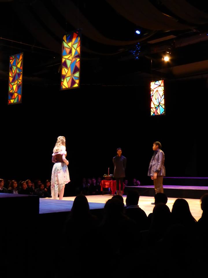 The stage-crew did a fantastic job transforming the auditorium into the streets of Verona. The stained glass windows in Friar Lawrence’s chapel and the stars that lit the balcony scenes were particularly beautiful and creative features of the set. The production included many scene changes back and forth between Juliet’s room, Friar Lawrence’s chapel, the streets of Verona, etc., but the stage crew was swift and efficient at changing out the set pieces and keeping the show running smoothly. The stage, which spanned three-quarters of the auditorium, stationed the audience within arm’s-reach of the action and made the audience feel more involved in the production.